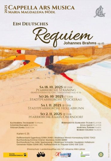 Der überregionale Chor "Cappella Ars Musica", unter der Leitung von Frau Prof. Maria Magdalena Nödl, präsentiert "Ein deutsches Requiem" von Johannes Brahms.